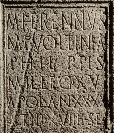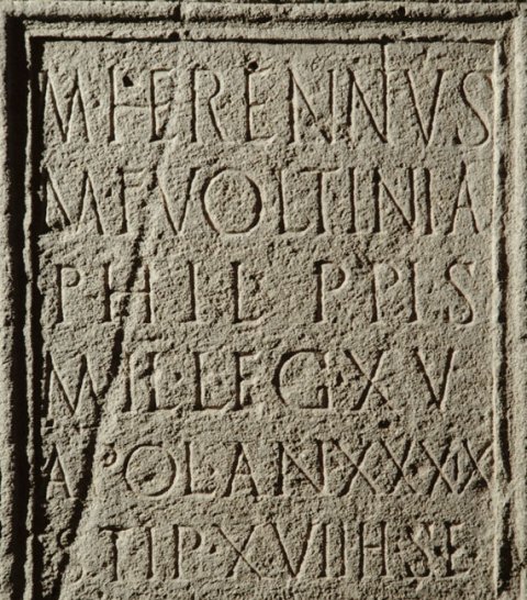 - M(arcus) Herennius / M(arci) f(ilius) Voltinia / Phil(i)ppis / mil(es) leg(ionis) XV / Apol(linaris) an(norum) XXXIX / stip(endiorum) XVII h(ic) s(itus) e(st)