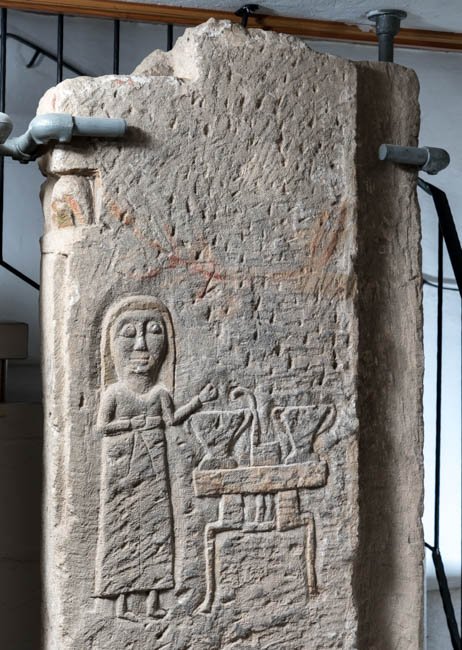 Linke Wand: Totenopfer. Tisch mit 2 Gefäßen und Schöpfkelle, links Dienerin, darüber gemalte Girlande. An der linken Schmalseite oben Blattkapitell.
