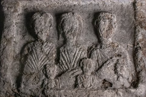Im Hauptbild Familie: zwischen Säulen Brustbilder von drei Erwachsenen und zwei Kindern. Links Mann: bärtig, Mantel. In der Mitte Frau mit Ohrgehängen. Rechts Mann: Sagum, in der Linken Rolle (volumen). Vorn links Knabe, rechts Mädchen, beide mit großer Frucht in den Händen.