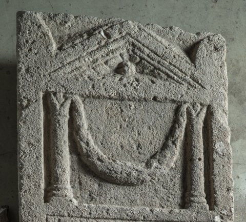 - Eingeschriebener Giebel mit Rosette und Seitenakroteren. Im Hauptbild Girlande zwischen Säulen.