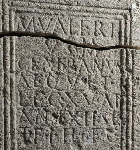 - M(arcus) Valeri/us M(arci) f(ilius) / Cl(audia) Albanus / Aeq(uiculis) vet(eranus) / leg(ionis) XV Ap(ollinaris) / an(norum) LX h(ic) s(itus) e(st) / t(estamento) f(ieri) i(ussit) h(eres) f(aciendum) c(uravit)