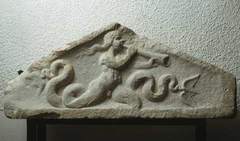 - Giebel mit Meerwesen: Triton mit zwei Fischschwänzen bläst in Muschelhorn.