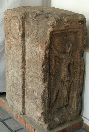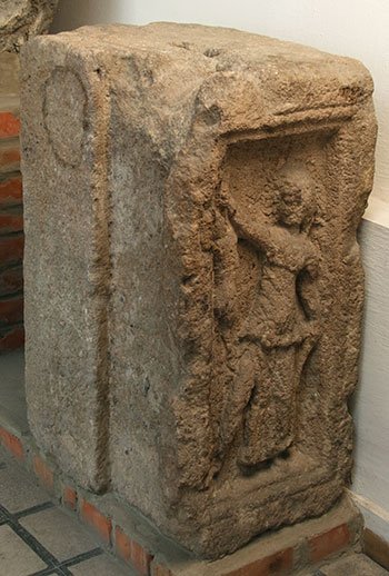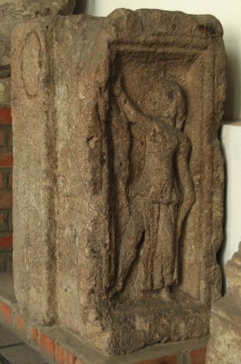 - Eckblock. Mythische Figur: profiliert gerahmtes Bildfeld, darin Frau mit offenem Haar und langem Gewand mit Überschlag, in der erhobenen Rechten erlegtes Tier (Jahreszeit, Personifikation des Winters ? Diana ?).