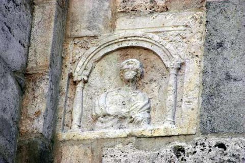 - Unter Bogen auf Säulen Halbfigur einer einheimischen Frau: Haare zu Kranz geflochten, Unter- und Obergewand, Fibeln, Umhang. Seitlich des Bogens Rosetten zwischen Blättern.