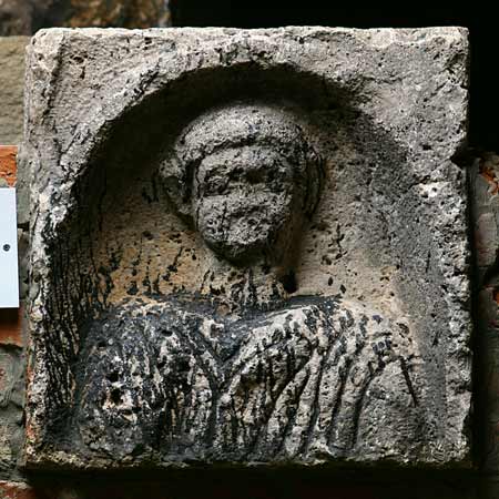 - In Bogennische Brustbild eines Mannes: bartlos (?), glattes Haar, Paenula ?