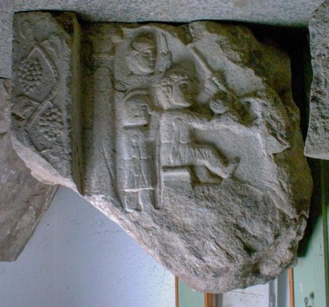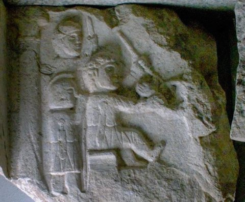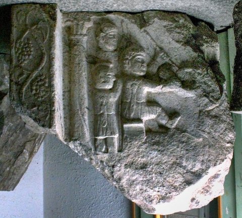 Links vorspringender Pfeiler mit Weinranke, rechts davon von Säulen gerahmtes Relief (Mythos ?): sitzender bekleideter Mann, an der Seite Dolch (?), in der erhobenen Linken Stab (Waffe ?). Vor ihm (rechts) Reste einer knienden (?) Figur, deren Arm er mit der vorgestreckten rechten Hand umfasst. Hinter ihm zwei übereinander gestaffelt stehende Figuren: vorn kleinerer Mann in Helm und kurzem Gewand, an der Seite Schwert (?), dahinter bärtiger Mann mit Stab (Waffe ?) in der erhobenen Hand.