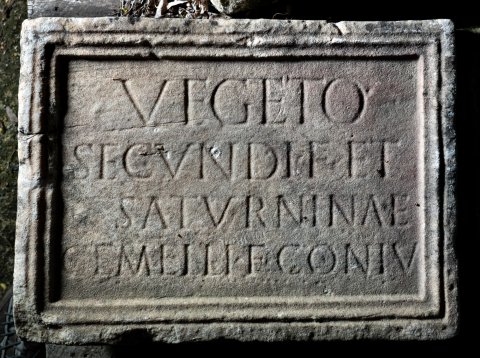 - Vegeto / Secundi f(ilio) et / Saturninae / Gemelli f(iliae) coniu(gi)
