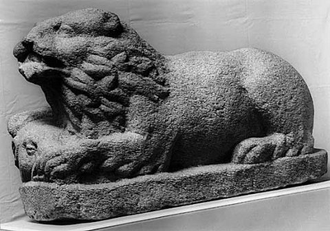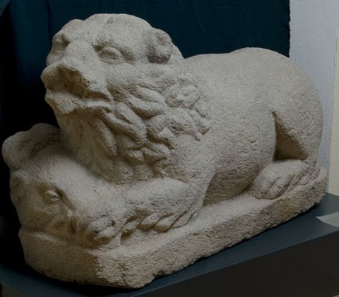 - Auf flacher Basisleiste liegender Löwe mit Eberkopf in den Pranken.