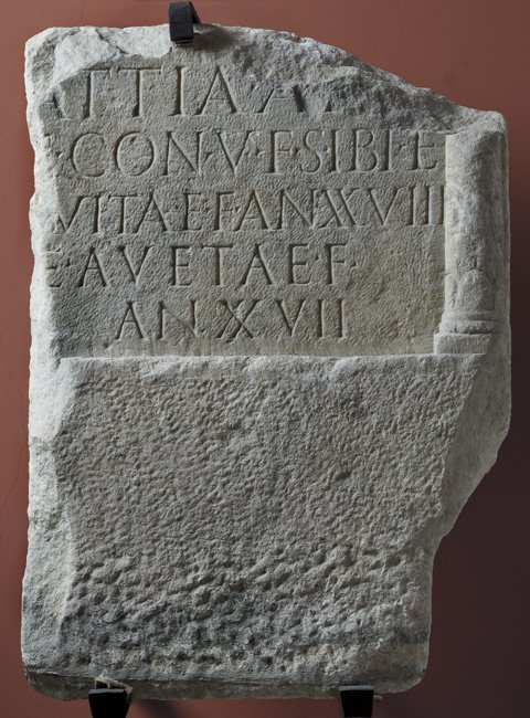 ... und seine Frau Attia, die Tochter des A..., haben für sich und für die Tochter Avita, mit 28 Jahren gestorben, und für die Tochter Aveta, mit 27 Jahren gestorben, (dieses Denkmal) zu Lebzeiten errichtet.