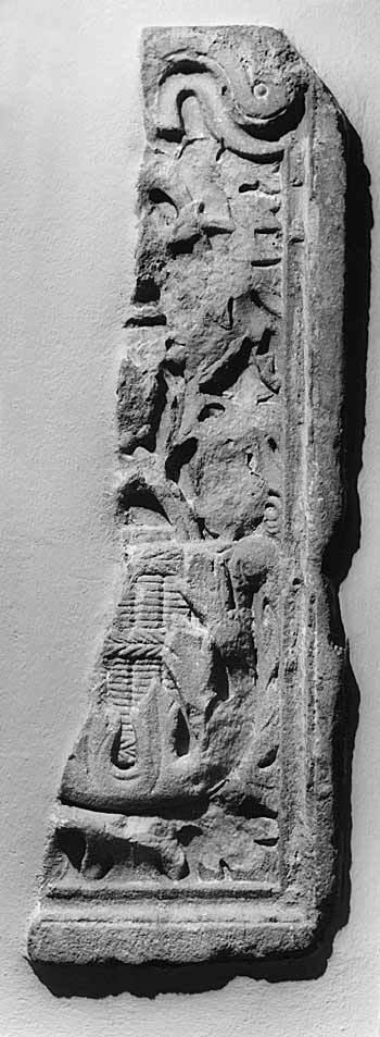 - Hochrechteckiges Feld mit oben geschwungenem Rahmen, Akanthuskelch, darin Korb, aus dem Ranken wachsen.
