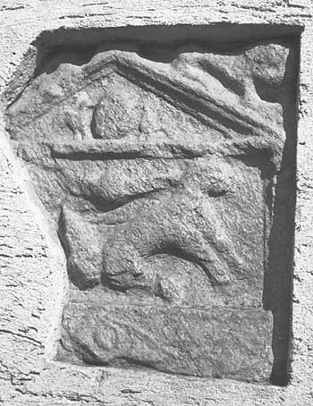 Eingeschriebener Giebel mit Gorgoneion (?) zwischen Vögeln, auf den Schrägen liegende Löwen.