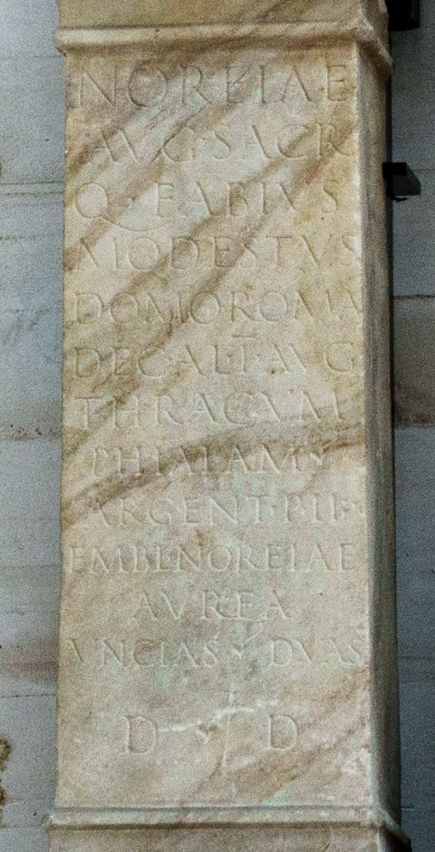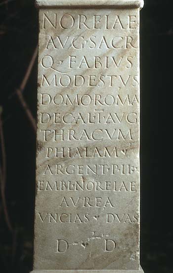 - Noreiae / Aug(ustae) sacr(um) / Q(uintus) Fabius / Modestus / domo Roma / dec(urio) al(ae) I Aug(ustae) / Thracum / phialam / argent(eam) p(ondo) II (quadrantem) / embl(ema) Noreiae / aurea / uncias duas / d(onum) d(edit)