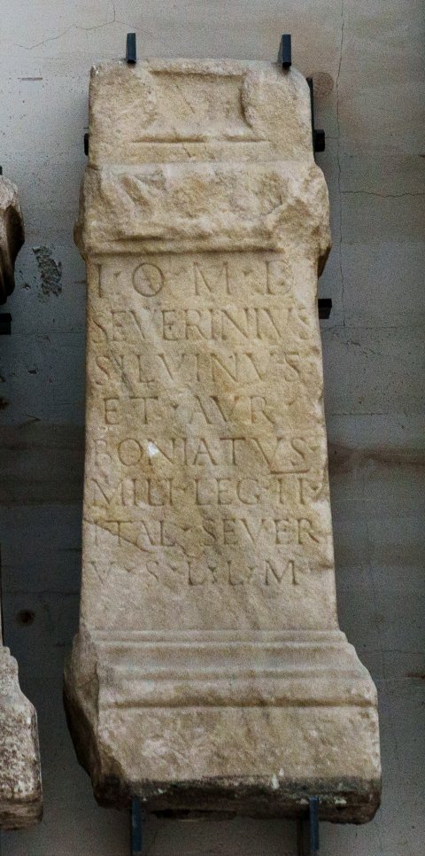 - I(ovi) O(ptimo) M(aximo) D(olicheno) / Severinius / Silv/inus / et Aur(elius) / Boniatus / mili(tes) leg(ionis) II / Ital(icae) Severi(anae) / v(otum) s(olverunt) l(aeti) l(ibentes) m(erito)