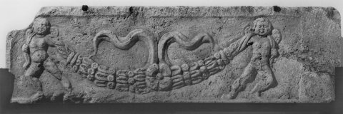 - Zwei nackte geflügelte Knaben (Genius) halten große Girlande mit Rosette und Tänien.