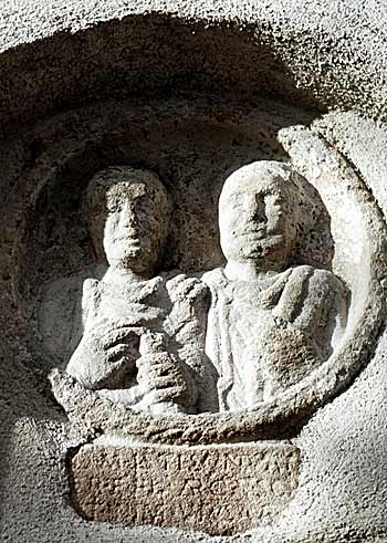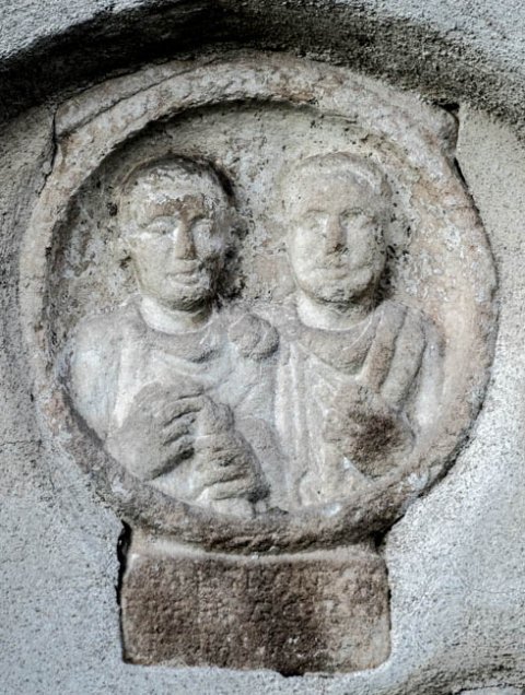 - In Kranzrahmen Brustbilder von zwei Männern. Links: bartlos (?), Sagum, in der Linken Rolle (volumen). Rechts: bartlos (?); Sagum mit Fransen, Scheibenfibel.