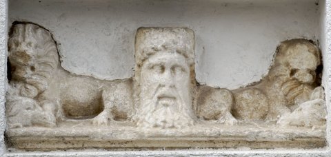 - Auf profiliertem Gesims bärtiger Kopf mit Polos zwischen liegenden Löwen mit Widderköpfen in den Pranken.