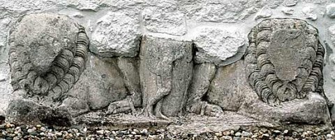 - Zwischen liegenden Löwen glatte Ciste (?), darauf Relief eines stehenden nackten Mannes (Mars, Heros ?) mit Schild.