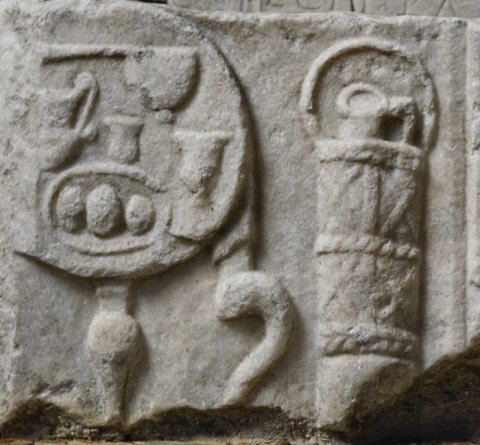 - Totenopfer: Tisch mit Gefäßen, rechts daneben zylindrisches Gefäß. Rechts Rahmen eines 2. Feldes.