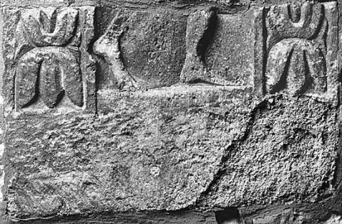 - Diener (?), mythische Figur (?): zwischen zwei Pilastern mit Blattdekor Unterschenkel einer nach rechts gehenden Figur.