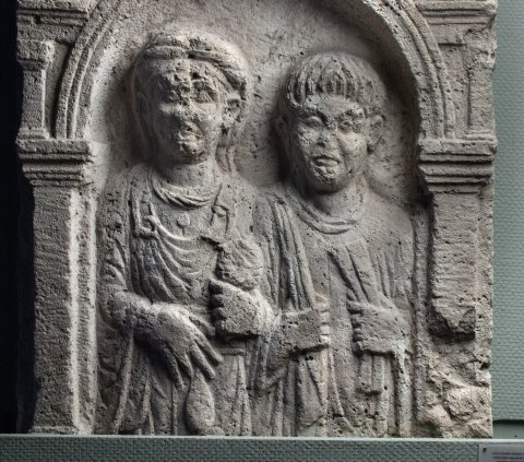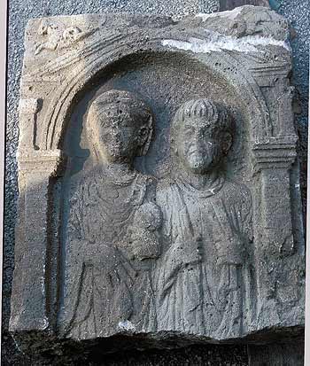 Hauptbild mit profiliert gerahmtem Bogen auf Pilastern. Zwei Ganzfiguren (Ehepaar). Links einheimische Frau: Haube, Schleier, Unter- und gegürtetes Obergewand, Flügelfibeln, Torques, Spindel. Rechts Mann: bartlos, gesträhntes Haar, Halstuch, Paenula, in der Linken zusammengefaltetes Tuch oder Rolle (volumen).