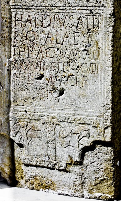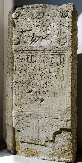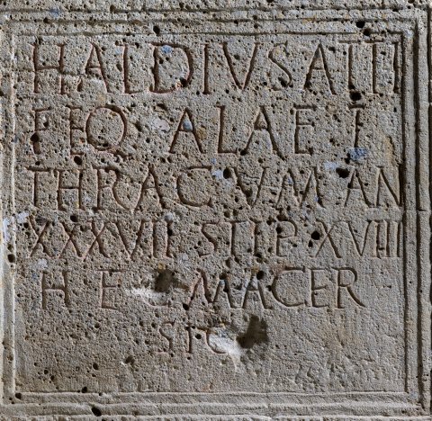 - Haldius Atti / f(ilius) eq(ues) alae I Thracum an(norum) / XXXVII stip(endiorum) XVIII h(ic) e(st situs) C(aius) Macer / sig(nifer)