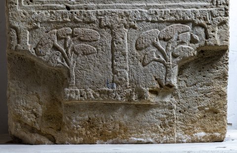 Im Sockelbild Pflanzen zwischen Säulen. - Inschrift