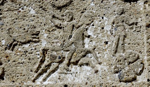 Im Hauptbild Jagdszene: Reiter, rechts kleine Figur, links Tier, in den Ecken Rosetten.