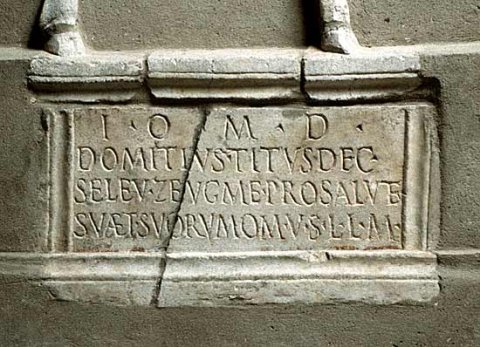 - I(ovi) O(ptimo) M(aximo) D(olicheno) / Domitius Titus dec(urio) / Seleu(cia) Zeugm(a)e pro salute / sua et suorum om(nium) v(otum) s(olvit) l(aetus) l(ibens) m(erito)