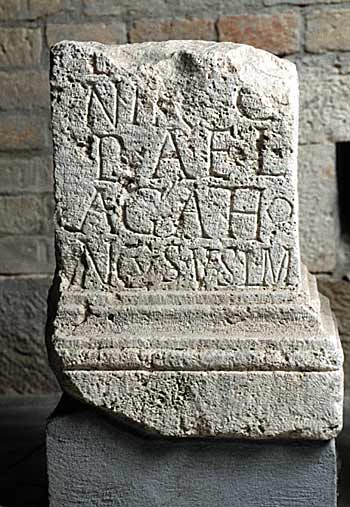 - [I(ovi) o(ptimo) m(aximo)] / et [Iuno]/ni reg(inae) / P(ublius) Ael(ius) / Agatho/nicus v(otum) s(olvit) l(ibens) m(erito)