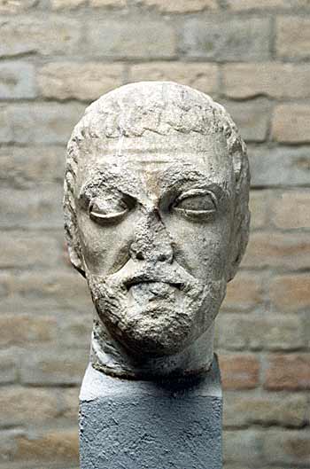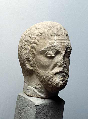 - Kopf eines Mannes: Haar und Vollbart kurzgelockt, Stirn- und Wangenfalten.
