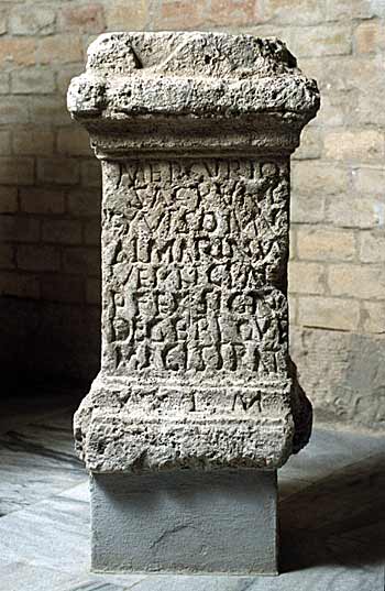- Mercurio / sacrum / ex viso M(arcus) V/al(erius) Marinus / vet(eranus) leg(ionis) I ad(iutricis) / p(iae) f(idelis) ex sign(ifero) / dec(urio) Bri(getionis) qui / magistrat // v(otum) s(olvit) l(ibens) m(erito)