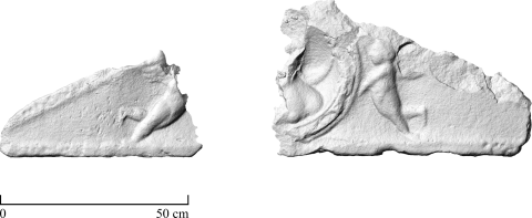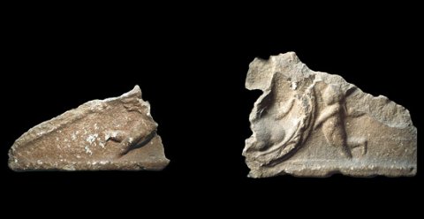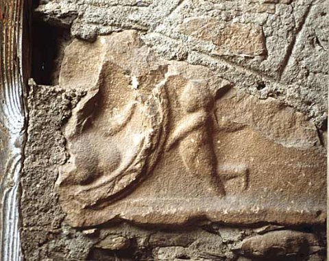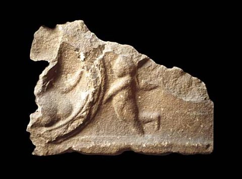 - zwei nackte geflügelte Knaben (Genius) halten Medaillon mit Büste einer Frau (?) vor einer Mondsichel.
