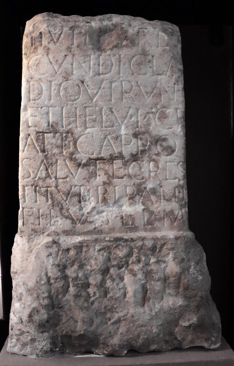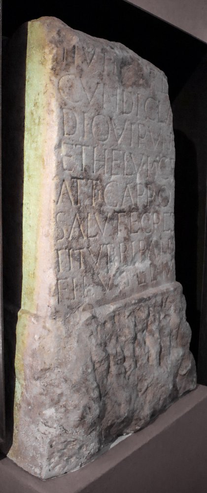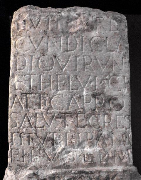 - [------] / [Restitutius --] II vir [iu]re di/cundi(!) Cla[u]dio Viruno / et Helvia C(ai) f(ilia) / Attica pro salute C(ai) Res/tituti Ripani / fil(ii) v(otum) s(olverunt) l(ibentes) l(aeti) m(erito)