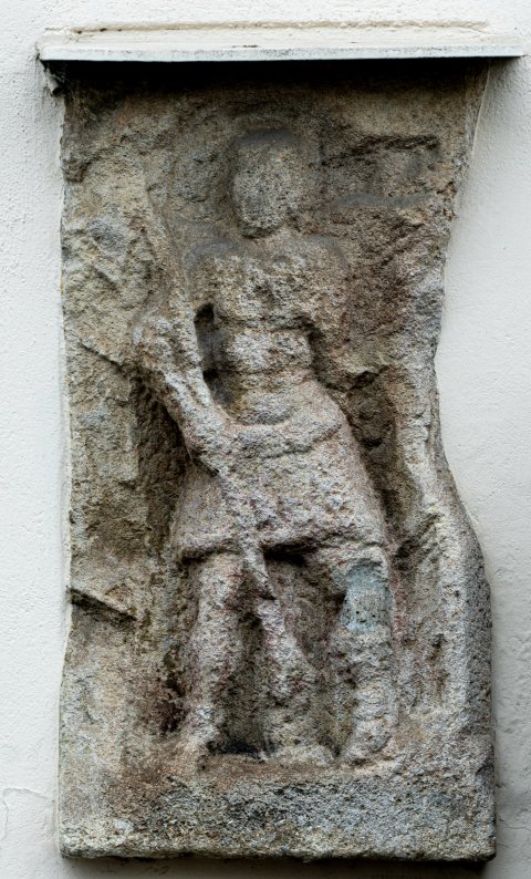 - Mythische Figur (Mars) oder Soldat (?): in einfach gerahmter Bogennische ausschreitender Mann in Stiefeln. Waffen: Brustpanzer mit Pteryges, in der Linken Rundschild, im rechten Arm Lanze (Stabkeule ?).