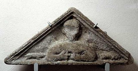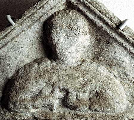 - Im Giebelfeld Brustbild eines Kindes (Knabe) mit gesträhntem Haar und Sagum, in den Händen Vogel (?), seitlich je ein Tier.