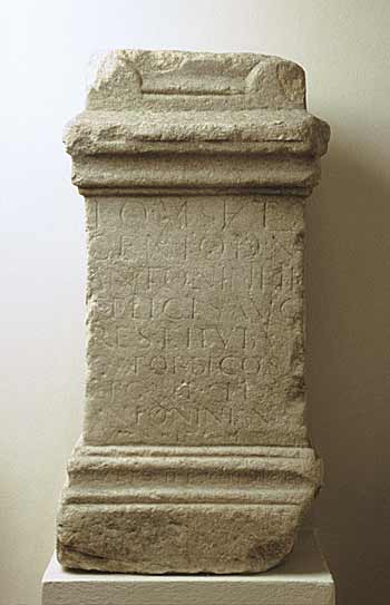 - I(ovi) O(ptimo) M(aximo) et / Genio d(omini) n(ostri) / Antonini Pii / Felicis Aug(usti) / Restitutiu[s] / [T]utor b(ene)f(iciarius) co(n)s(ularis) / leg(ionis) II Ita(licae) / Antoninian(ae) / v(otum) s(olvit) l(ibens) m(erito) // Laeto II et Ceriale co(n)s(ulibus)