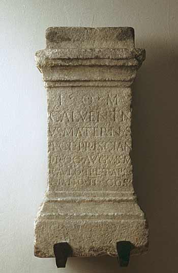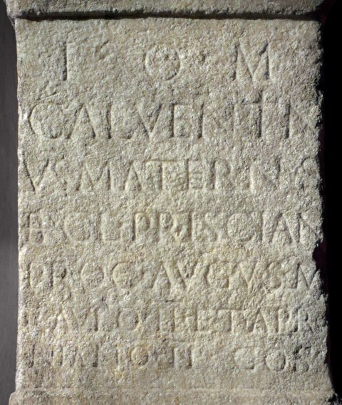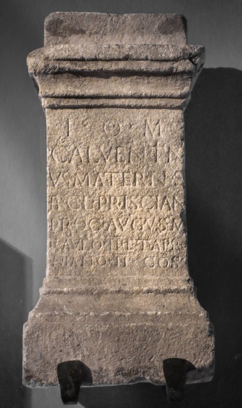 - I(ovi) o(ptimo) m(aximo) / Calventini/us Maternus / b(ene)f(iciarius) Cl(audii) Priscinian[i] / proc(uratoris) Aug(usti) v(otum) s(olvit) m(erito) / Paulo II et Apro/niano II co(n)s(ulibus)