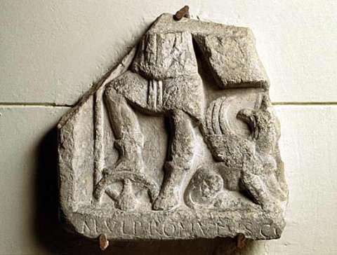 - Mythische Figur (Nemesis): Unterkörper mit kurzem Gewand und Stiefeln, rechter Fuß auf Rad, daneben Speer, in der Linken Schild, darunter sitzender Greif.