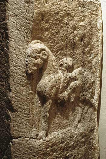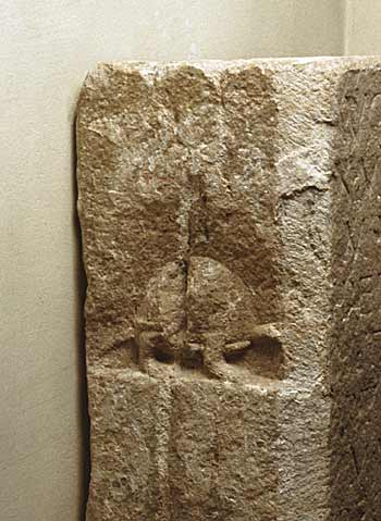 - Auf den Nebenseiten auf halber Höhe des Altarschaftes eingetieftes Feld mit Tier. Links Schildkröte, rechts stehender Widder, der etwas auf dem Rücken trägt.