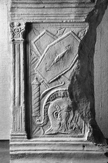 Auf den Nebenseiten Waffen zwischen Pilastern. Links Helm, Köcher, Bogen, Pfeile, zwei sechseckige Schilde, Lanzen. Rechts Panzer mit Pteryges und Streifenschurz, Bogen, Pfeile. - Inschrift