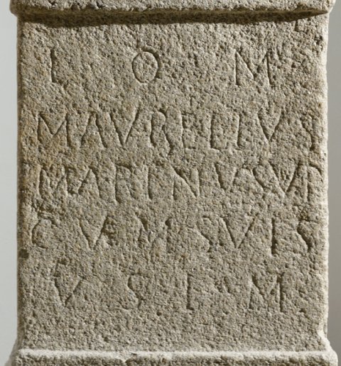 - I(ovi) o(ptimo) m(aximo) / M(arcus) Aurelius / Marinus v(ir) p(erfectissimus) / cum suis / v(otum) s(olvit) l(ibens) m(erito)