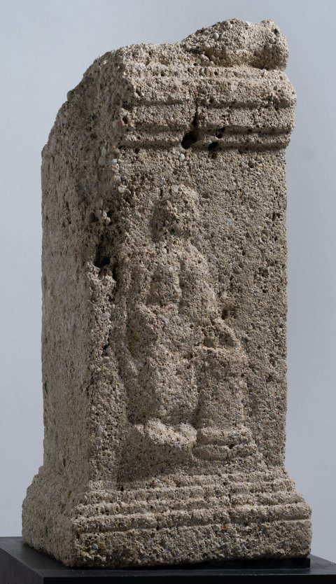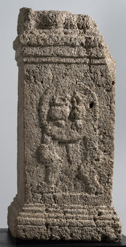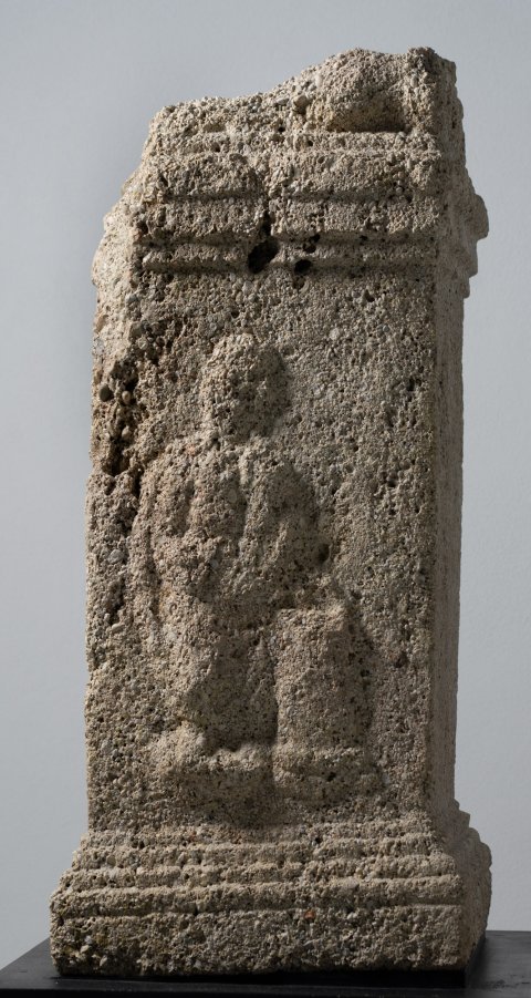 Auf der linken Nebenseite auf niedrigem Podest stehender Mann in Toga, gießt Schale über einem Altar aus. Auf der rechten Nebenseite rundes dreibeiniges Tischchen, darauf Kanne und zweihenkeliges Gefäß. - Inschrift
