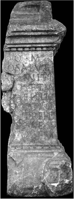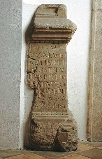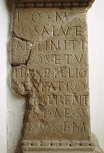 - I(ovi) o(ptimo) m(aximo) / [ p]ro salute / [P(ublii) ] Ae(lii) Finiti / [ b(ene)]f(iciarii) co(n)s(ularis) et Tu/lliae Felici/tati patro/nis merent/[ibu]s P(ublius) Ae(lius) Su/[ru]s v(otum) s(olvit) l(ibens) m(erito)