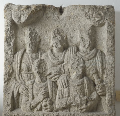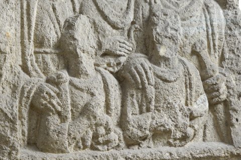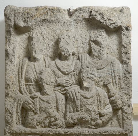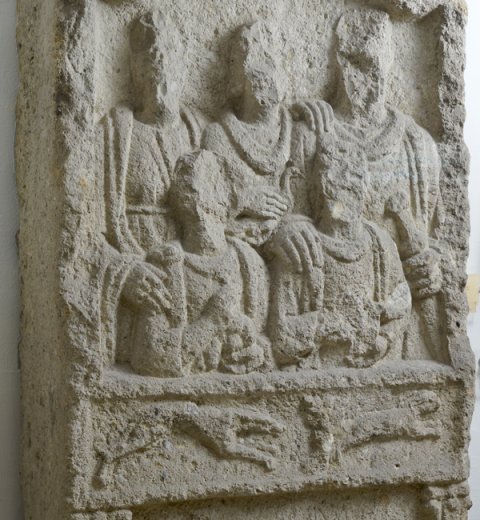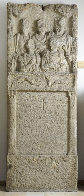 - Im Hauptbild Familie: unter Doppelbogen mit Volutenenden Halbfiguren von drei Erwachsenen und zwei Kindern. Links Frau: Kleid mit Gürtel, Umhang. In der Mitte Mädchen: Schal, in den Händen Vogel. Rechts Mann (Soldat): bärtig (?), Ärmeltunica, Sagum. Waffen: in der Linken Schwert. Vorn links Knabe: Ärmeltunica, Sagum, Rosettenfibel, in den Händen Hase. Rechts Knabe: Ärmeltunica, Sagum, in den Händen Wasservogel. Im Zwischenfries Tiere: Hund jagt Hasen, Baum. Schriftfeld zwischen Säulen.