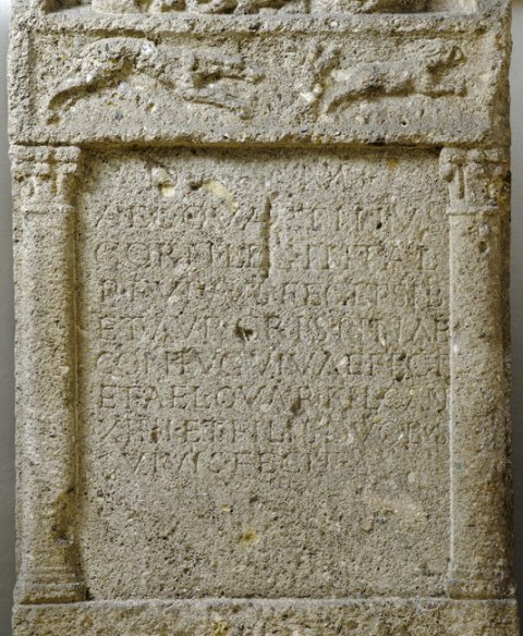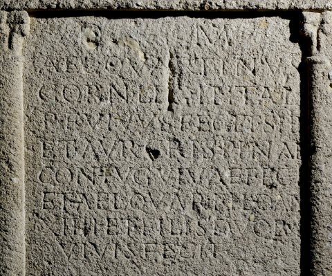 - D(is) M(anibus) / Ael(ius) Quartinus / corn(icularius) leg(ionis) II Ital(icae) / p(iae) f(idelis) vivus fecit sibi / et Aur(eliae) Crispinae / coniug(i) vivae fecit / et Ael(iae) Quar(tinae) fil(iae) o(bitae) an(norum) / XIIII et fili(i)s duobus / vivis fecit