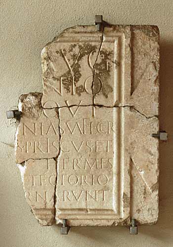 - [Fortun]ae Aug(ustae) / [--- et Ge]nio / [Manliensiu]m qui / [sacellum pec]unia sua fecer(unt) / [---]s Priscus et / [---] Hermes / [--- oper]e tectorio / [--- o]rna(ve)runt