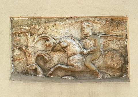 - Jagdszene: Reiter nach links galoppierend, vor ihm Rest eines Tieres und Baum.