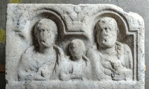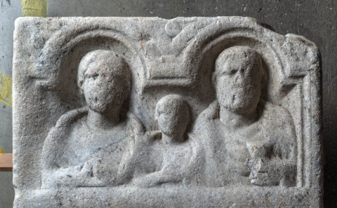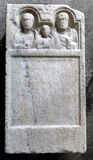 - Familie: unter Doppelbogen Brustbilder eines Ehepaares mit Kind. Links Frau: gewelltes Haar mit Mittelscheitel, Mantel, in der Rechten Frucht. Rechts Mann: bärtig, Locken, Sagum mit Fransen, Scheibenfibel, in der Linken Rolle (volumen) oder Schwert (?). Zwischen den Eltern Mädchen: Tunica, Mantel.