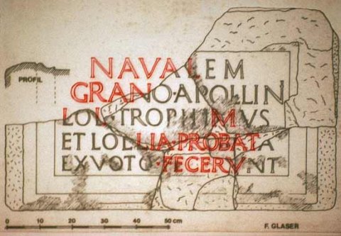 - [Nav]alem / [Gra]no(!) Apollini / Lol(lius) Trophimus / et Loll[ia Pro]b[at]a / ex voto f[eceru]nt // n[avalem] / Grano(!) A[pollini] / Lo[l]lius Troph[imus] / [et Lo]ll[ia Probata] / [ex] voto f[ecerunt]
