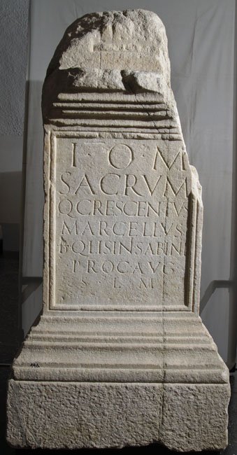 - I(ovi) o(ptimo) m(aximo) / sacrum / Q(uintus) Crescentius / Marcellus / b(ene)f(iciarius) Q(uinti) Lisini(i) Sabini / proc(uratoris) Aug/usti) / s(olvit) l(ibens) m(erito)